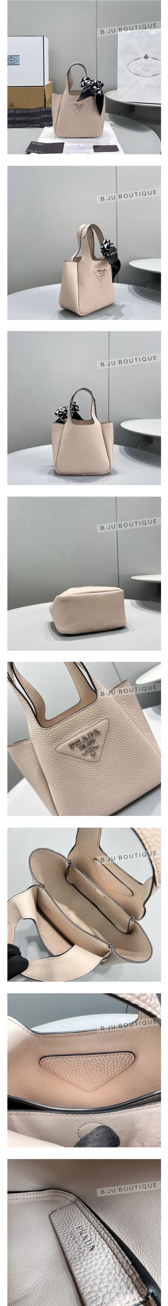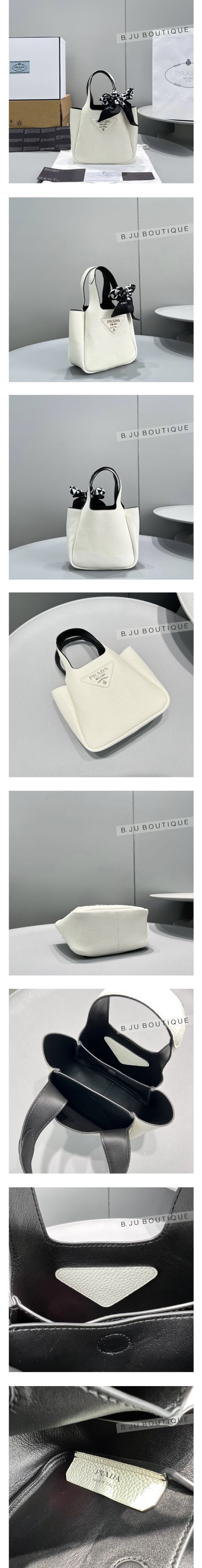 중앙에는 프라다 메탈 레터링 로고가 반짝입니다.
